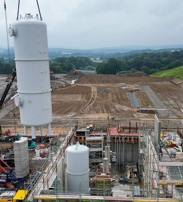 Die Stadtwerke Bochum arbeiten derzeit an der Umsetzung eines ganz neuen Konzepts, um die voranzutreiben: Mit einer Kombination aus dem Grubenwasser einer stillgelegten Kohlezeche und dem Einsatz von Wärmepumpen soll in Zukunft die Wärme- und Kälteversorgung des Gewerbegebiets MARK 51°7 gesichert werden. Auf einer Fläche von circa 70 Hektar entsteht hier bis 2027 ein innovativer Stadtteil mit Büros und Forschungseinrichtungen. Herzstück der Energieversorgung auf dem ehemaligen Opel-Werksgelände im Bochumer Osten bildet dabei die Energiezentrale Ost, die aktuell noch im Bau ist. „Mit der geplanten Nutzung von Geothermie werden wir eine energiesparende Wärme- und Kälteversorgung auf dem Areal sicherstellen und ein neues Wärmezeitalter beginnen“, sagt Elke Temme, Geschäftsführerin der Stadtwerke Bochum, in einer Pressemitteilung zum Vorhaben. Im Sommer wurden zwei Speichertürme für Wärme und Kälte in den Rohbau eingesetzt. Anfang 2026 soll die Zentrale planmäßig ihren Betrieb aufnehmen.